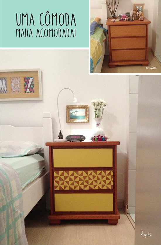Ainda na vibe do quarto do meu querido papi, resolvi transformar a mesinha de cabeceira caretinha que ele tinha por lá. Bastou fazer um mosaico com mini triângulos de papel adesivo Con-Tact e encapar as gavetas com o mesmo material pra virar um novo móvel! Fiquei tão apaixonada que quase peguei ela pra mim. Por pouco não rolou um: Perdeu, papai, perdeu! Kkkk