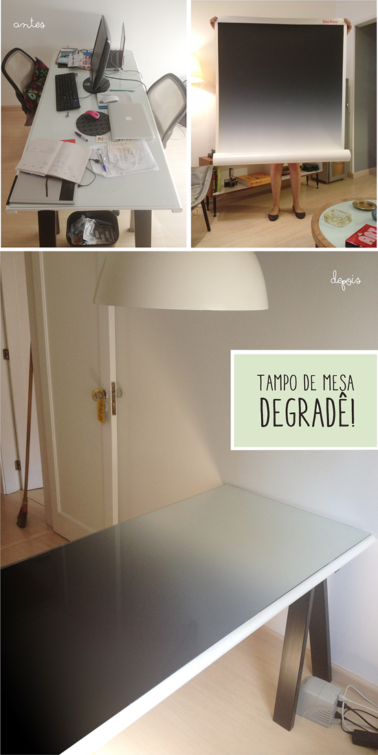 Estava eu saindo da manicure quando reparo num montinho de lixo mega promissor no prédio vizinho. Encontrei dois canudos de papelão enormes e que pareciam conter tesourinhos. Abri e encontrei dois fundos antigos (em degradê!!!) pra fotografia, um preto e outro azul. Eu quase tive um treco! Corri com eles pra casa antes que o ex-dono pudesse voltar arrependido e levar de volta. Cheguei em casa e não pensei duas vezes: Coloquei por baixo do vidro da mesa do meu home office. Imediatamente ganhei uma mesa mega estilosa e que parecia ter custado uma fortuna. Gamei!